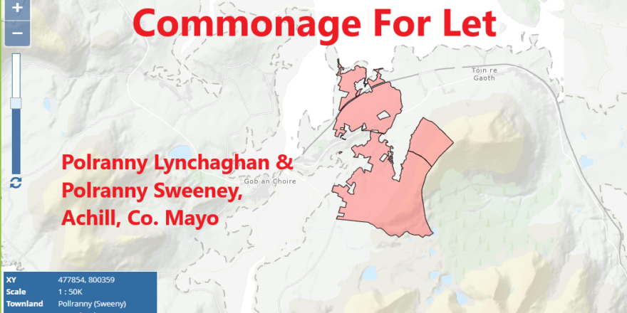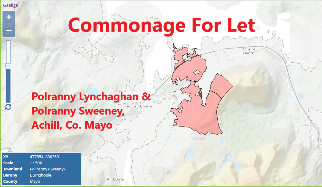 On the instructions of the owner we are offering to let commonage at Polranny Lynchaghan & Polranny Sweeney, Achill, Co. Mayo. The commonage is located north and south of the R319 County Road that interconnects Mulranny and Achill Sound.